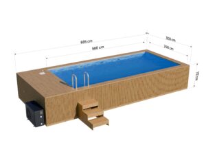 Bazén Premium SPA s jacuzzi 6,85 x 3 m dokonale snoubí moderní styl a použití solidních řešení. Díky tomu, že je vyroben ve stylu typickém pro skandinávskou architekturu, zapadá do aktuálně oblíbeného minimalismu. Obložení bazénu Thermo dřevem dokonale ladí s modrým vkladem z polypropylenového vlákna a působí tak elegantně. Navíc takový interiér zaručuje úplnou těsnost bazénu. Solidnost tohoto modelu je však ovlivněna tím, že je navíc vyztužený. Díky tomu nedochází k žádné deformaci konstrukce, např. vlivem hmotnosti vody nebo nepříznivých povětrnostních podmínek. Pro zajištění naprostého komfortu při používání je navíc bazén SPA vybaven dřevěnými schůdky a kovovým žebříkem.