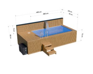 Bazén Premium SPA s protiproudem 4,85×2,35 m je spojením moderní estetiky s nepochybně odolnou konstrukcí. Za jeho vnější vzhled vděčí elegantnímu čalounění Thermo dřevem, které dokonale doplňuje typický skandinávský design. Použitím minimalistického stylu dokonale zapadá do aktuálních trendů. Doplněním bazénu Premium je jeho interiér, který tvoří modrá polypropylenová vložka. Přestože výrazně ovlivňuje estetiku modelu, jeho největší a nejdůležitější výhodou je jeho praktická stránka. Tato náplň činí proti proudový bazén zcela těsným. Navíc je pevný i proto, že celá konstrukce je vyztužena. Díky tomu si můžeme být jisti, že se nedeformuje vlivem váhy vody nebo nepříznivých povětrnostních podmínek. Pro pohodlné používání je navíc bazén vybaven dřevěnými schůdky a kovovým žebříkem.
