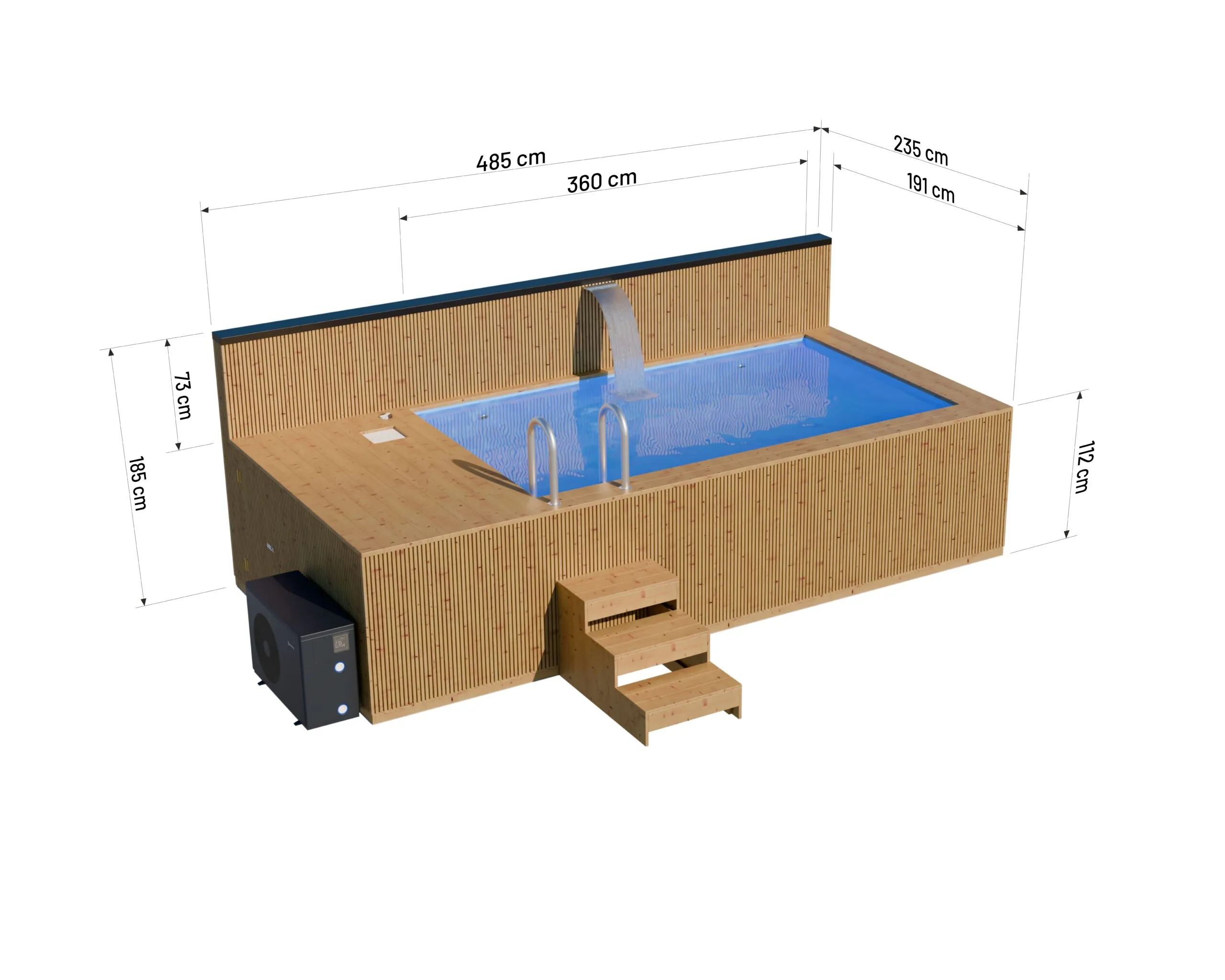 Wizualizacja basenu o wymiarach 4.8 x 2.3 m z piecem i wkładem, model Thermo, widok z perspektywy. Bez impregnace