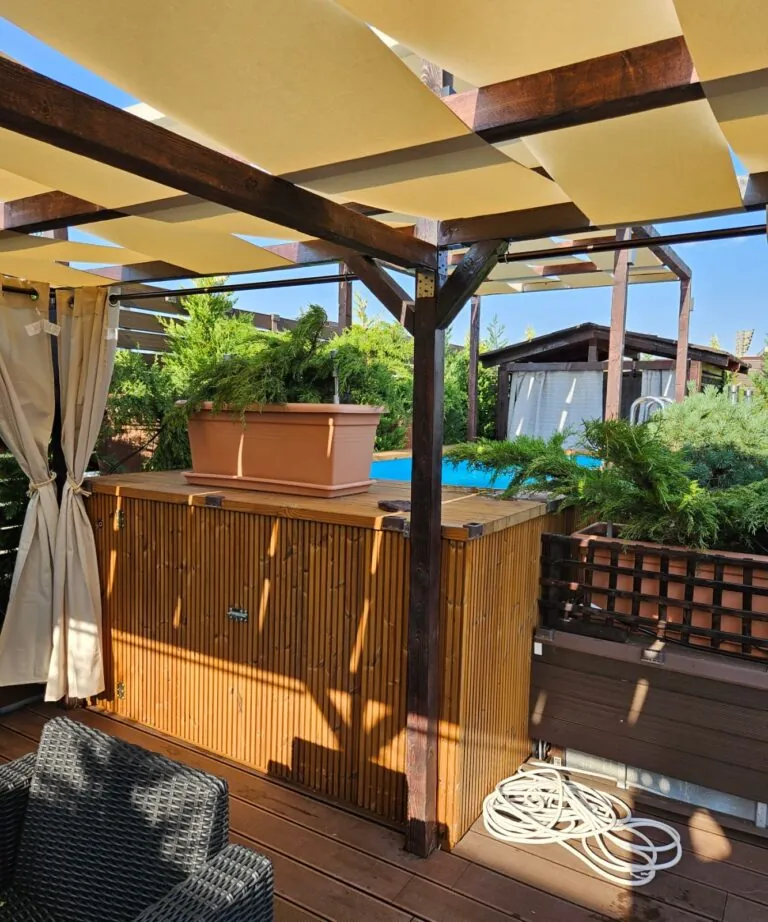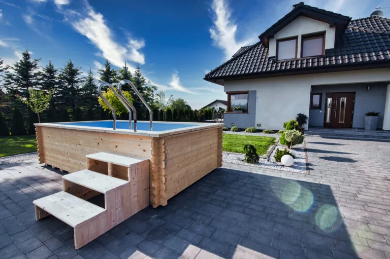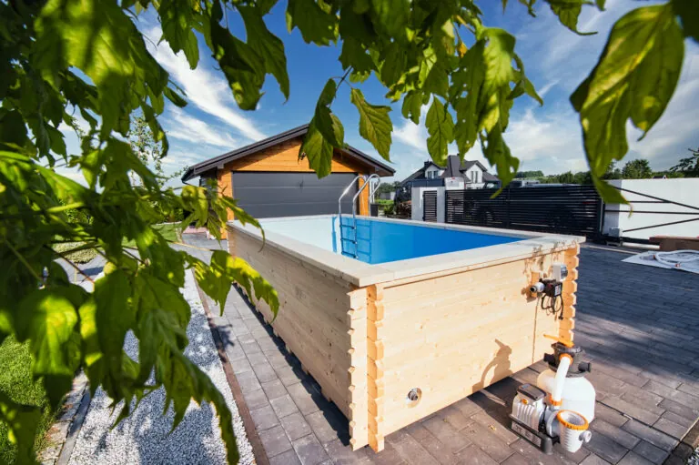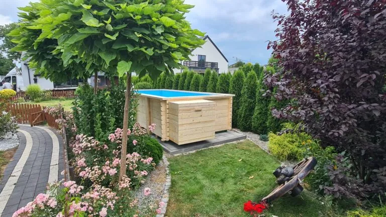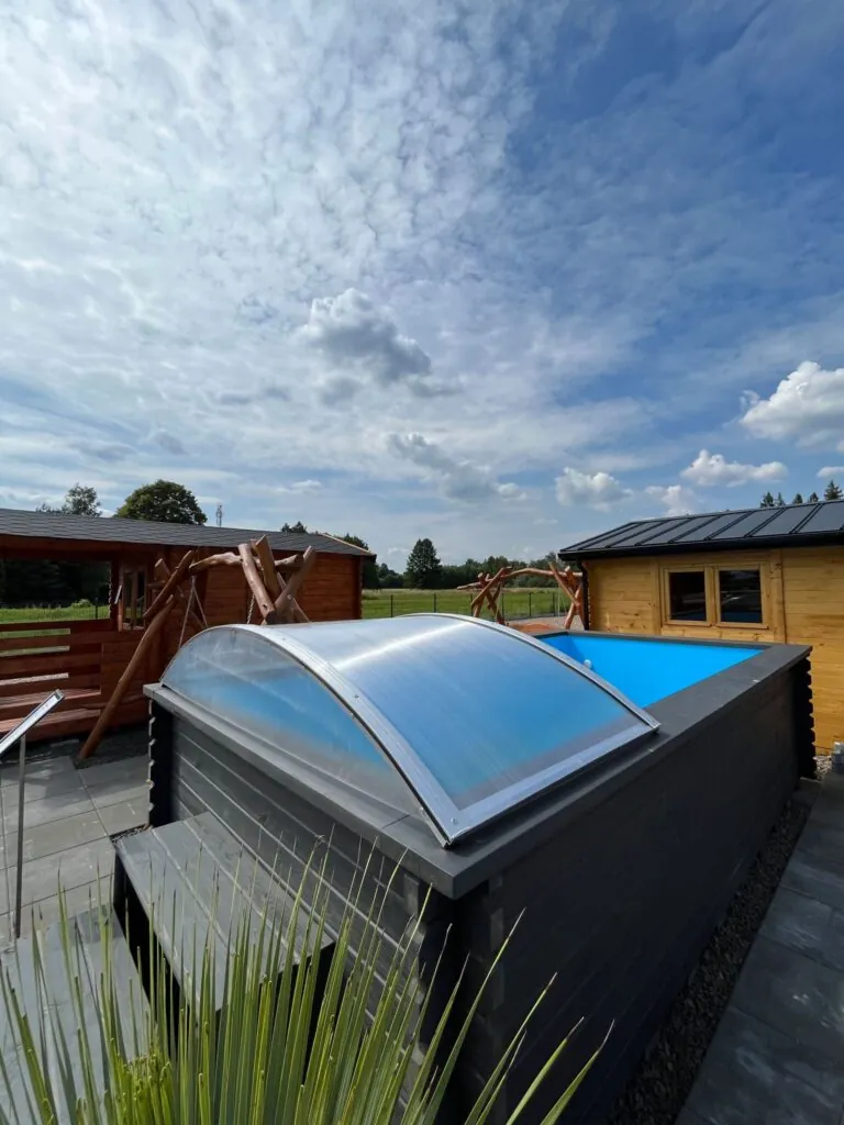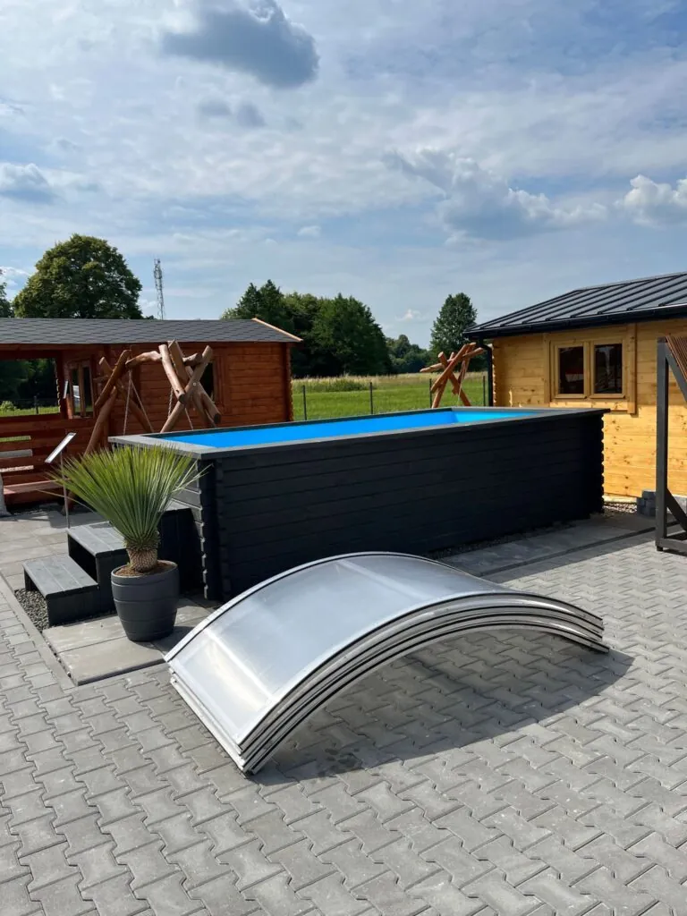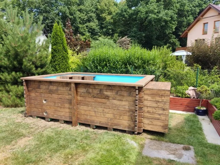 Dřevěný víčko – Solidní, estetické krytí vyrobené ze dřeva – dokonale ladí s konstrukcemi z přírodních materiálů a účinně chrání vnitřek bazénu.