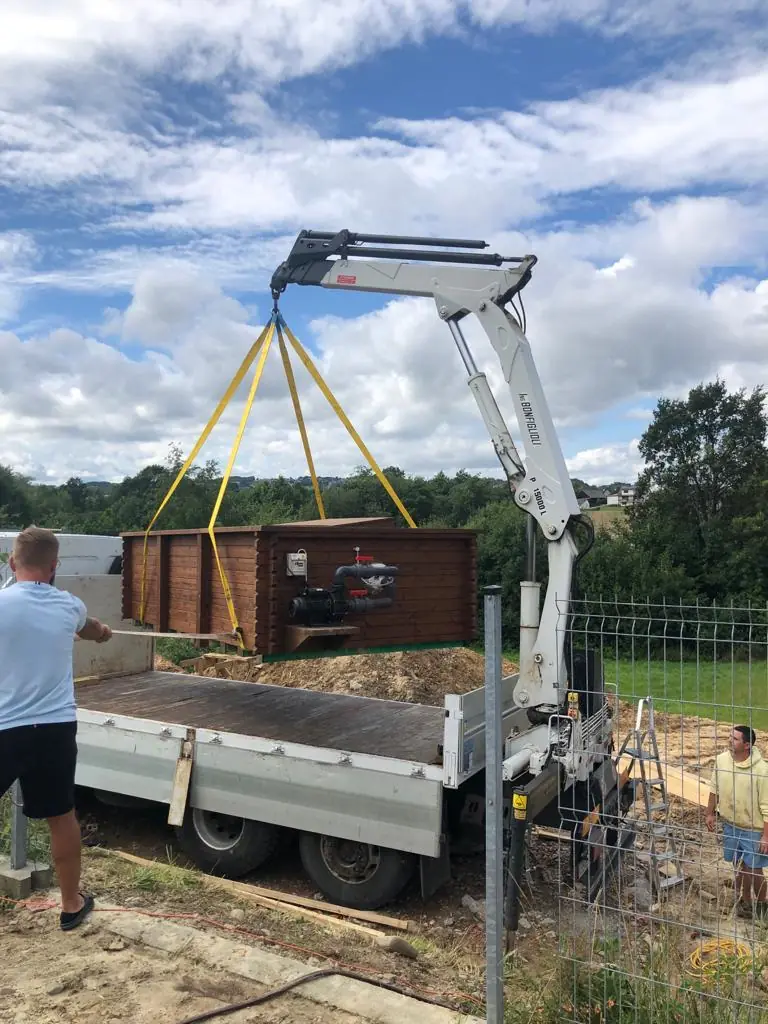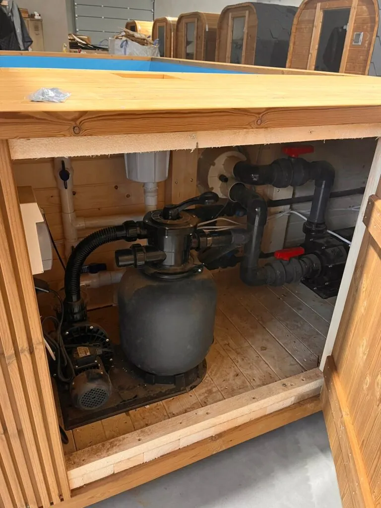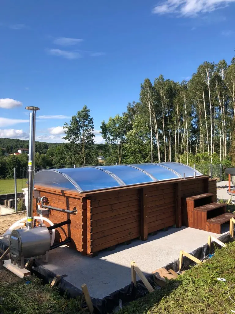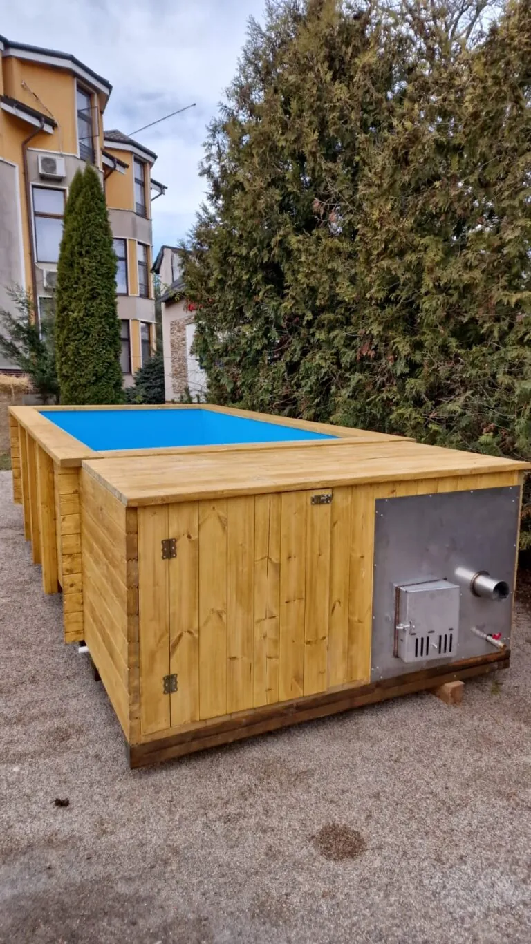 Integrovaná kamna na dřevo – Tradiční způsob ohřevu vody bez nutnosti připojení k elektrické síti. Pec je integrována do konstrukce bazénu a je ideální pro místa bez přístupu k elektrické energii.
