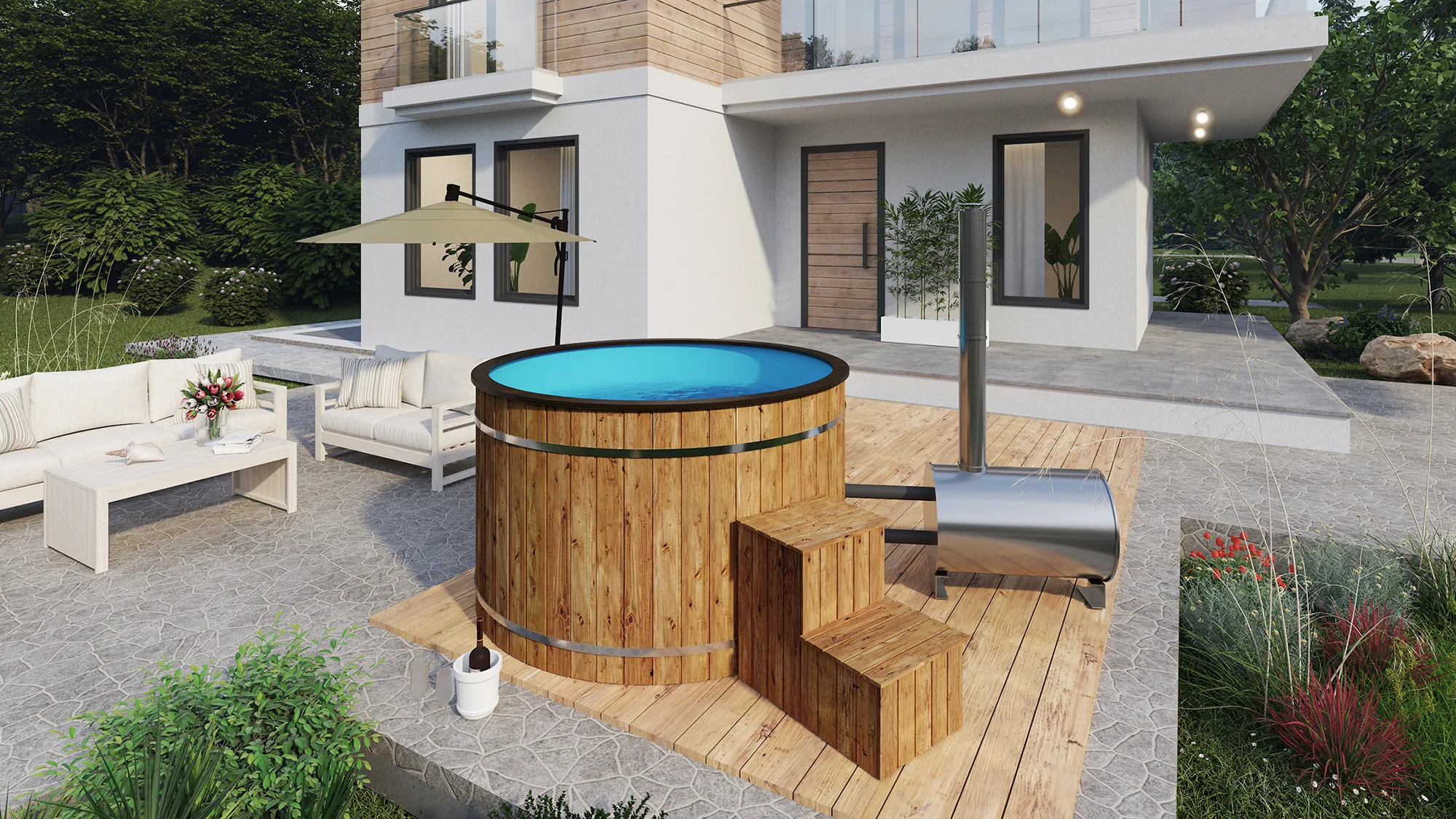 Zahradní káď o objemu 1 000 litrů pojme až pět osob a umožní příjemnou relaxaci ve společnosti příbuzných a přátel. Do kádě můžete vystoupat po dřevěných schůdcích a pak se posadit na pohodlnou lavici. Po koupeli se na káď položí dřevěný kryt.