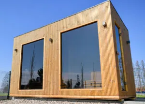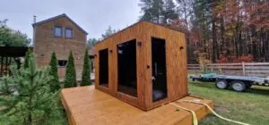 - Interiér je obložen thermo dřevem o tloušťce 19 mm