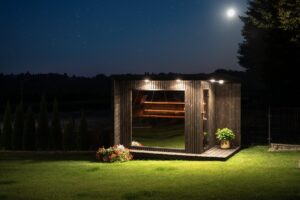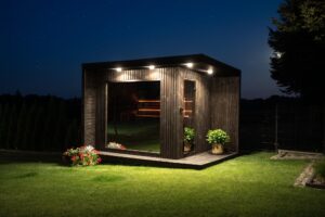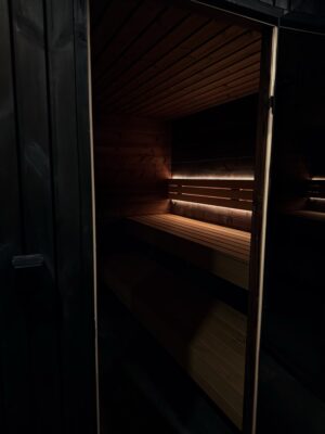 Sauna je také vybavena nejmodernějším ambientním LED osvětlením uvnitř a vnějším osvětlením terasy, které vytváří jedinečnou atmosféru i po setmění.