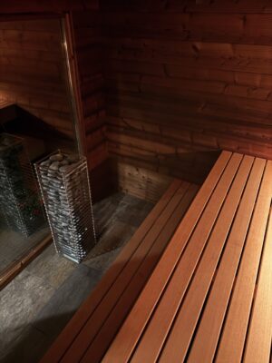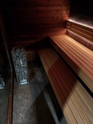Interiér sauny byl navržen s ohledem na maximální komfort při používání. Najdete zde dvoupatrovou levitující lavici ze dřeva Abachi, které je mimořádně příjemné na dotek a odolné vůči vysokým teplotám.